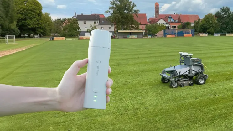 The V4E is a high-precision handheld surveying device designed for portable mapping on sports fields. It enables ground staff to quickly and accurately map boundaries, zones, and key maintenance areas.